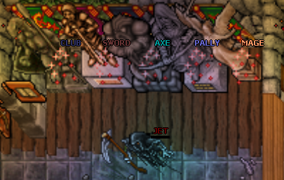 Nosso sistema de training offline funciona para players donate. Consiste em uma area com 5 estatuas, cada uma referente ao skill a ser treinado, seja ele Sword, Axe, Club, Distance ou Magic Level. Basta clicar sobre a estatua e seu char entra em estado de "Abstence" por até 12h caso não seja interrompido com login. Ou seja, voce pode ficar treinando ate 12h seguidas; apos isso seu personagem simplesmente para de treinar ate que voce logue ele novamente.